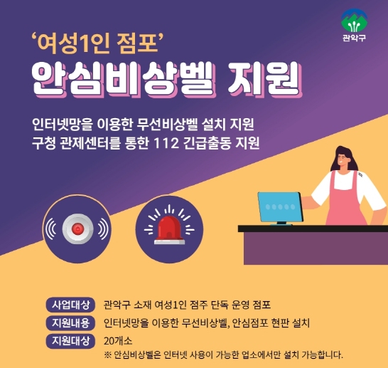 구는 최근 ‘여성 1인 점포’ 에 발생하는 범죄 예방을 위해 비상벨 설치 사업을 추진한다. 비상벨은 위급상황 발생 시 관악구 통합관제센터로 즉시 통화가 가능하고 112 긴급 출동이 가능하도록 연결하여 준다.