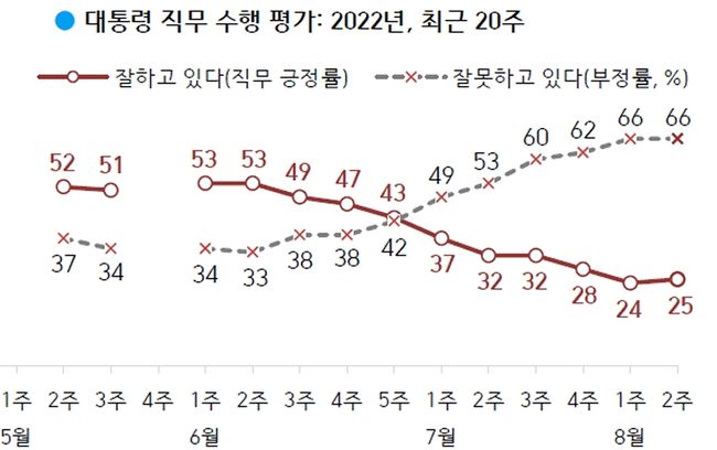 한국갤럽이 2022년 8월 둘째 주(9~11일) 전국 만 18세 이상 1,000명에게 윤석열 대통령이 현재 대통령으로서의 직무를 잘 수행하고 있다고 보는지 잘못 수행하고 있다고 보는지 물은 결과, 25%가 긍정 평가했고 66%는 부정 평가했으며 그 외는 의견을 유보했다.