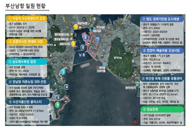 시는 부산남항의 관리청으로서 미래지향적인 종합 항만개발계획 수립을 통한 부산남항의 중장기적 발전방안을 제시하고자, 지난 6월 부산남항과 그 일원의 해양·수산·관광 자원을 연계·개발해 원도심(중·서·영도구)의 성장을 견인할 개발계획인 ‘부산남항 일원 종합개발 마스터플랜’ 수립 용역에 착수했다.