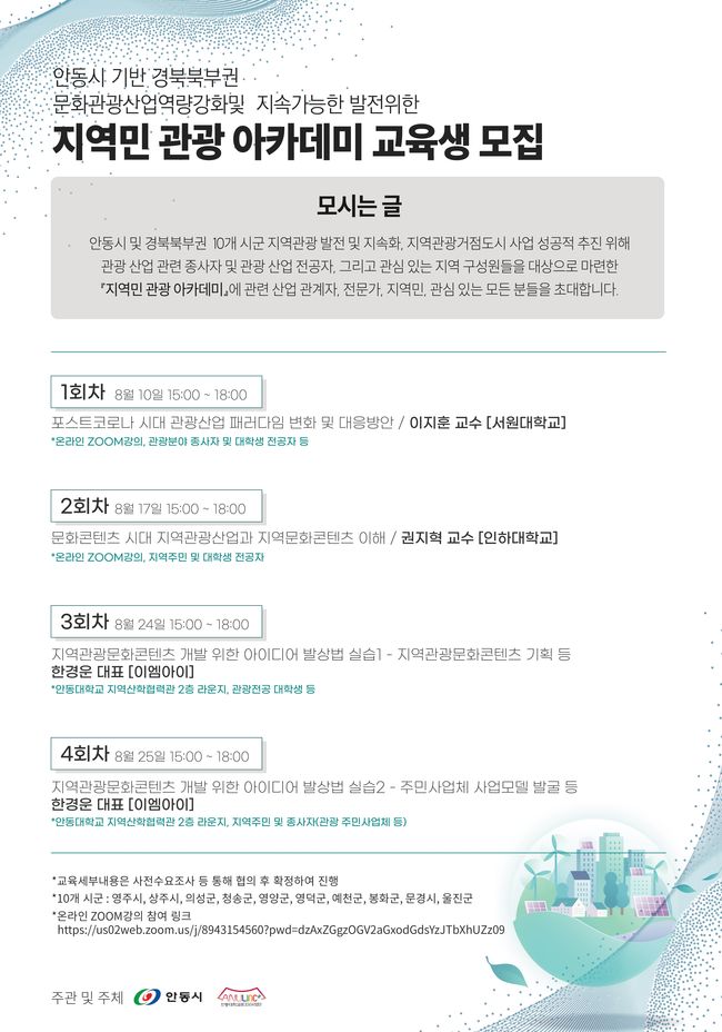 안동시는 지자체 주민 및 관광 유관 기업체를 대상으로 8월부터 온·오프라인을 활용한 관광 아카데미를 실시한다고 밝혔다.
