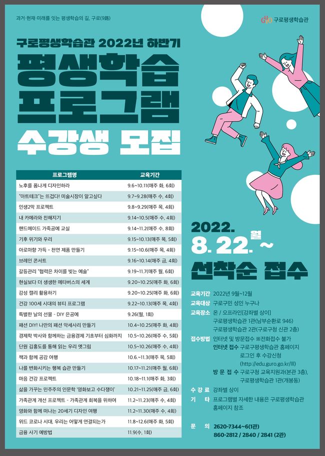 수강을 원하는 이는 구로평생학습관 홈페이지 온라인 신청이나 구청 교육지원과, 구로평생학습관 1관 방문 신청을 통해 가능하다. 선착순 모집.