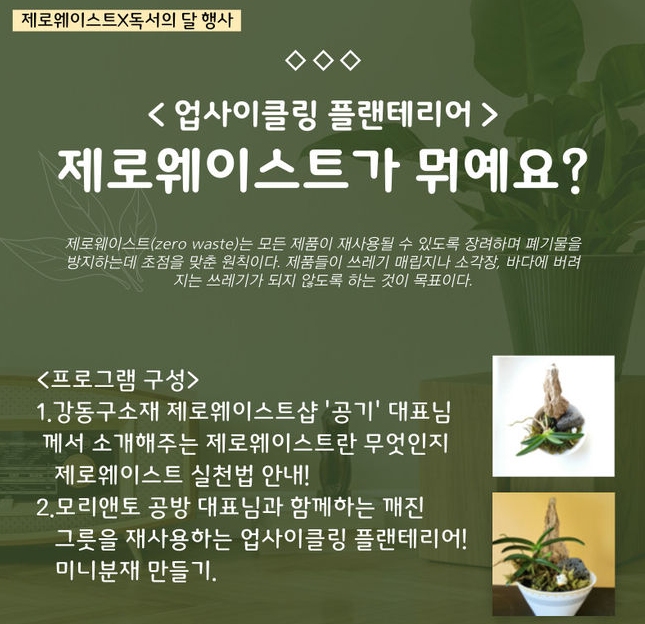 ‘제로웨이스트가 뭐예요?’는 오는 9월 17일, 제로웨이스트샵 ‘공기’와 콜라보하여 진행하며, 이가 나간 그릇에 살아있는 식물의 식재로 자연과 교감하여 어린이 대상으로 하는 업사이클링 프로그램이다. 또한, 친환경 제품을 도서관에서 직접 보고 구매할 수 있는 팝업스토어도 만날 수 있다.