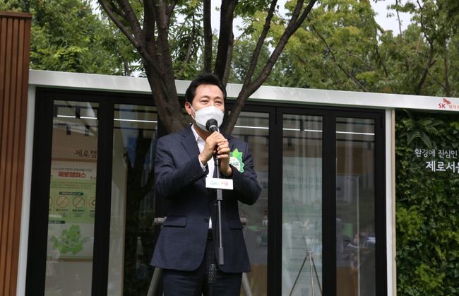 오세훈 서울시장이 24일 오전 서울시청 광장에서 열린 제로서울 프렌즈 출범식에서 인사말하고 있다. 시에 따르면 제로서울 프렌즈는 이 프로젝트에 자발적으로 동참한 청년 200여 명으로 구성됐으며, 이들은 앞으로 3개월간 서울시 주최 환경 캠페인 등에 참여하며 일회용품 줄이기에 앞장선다.