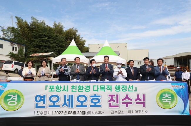 포항시는 신규 프로젝트인 다목적 행정선 ‘연오세오호’가 기초공사를 마무리하고, 29일 경남 거제시 소재 아시아조선에서 진수식을 개최했다고 밝혔다.