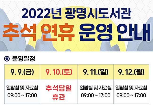 광명시는 추석 연휴 기간인 9월 9일부터 12일까지 지역 내에 머무는 시민의 여가와 문화생활 지원을 위해 4개 권역별 도서관을 개방한다.