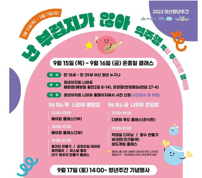 15일에는 청년아지트 나와유(배방점)에서 베이킹, 감정오일, 퍼스널컬러, 휴먼컬러, DIY 파우치 만들기 등의 클래스를 진행하며, 16일에는 청년아지트 나와유(온양점)에서 다문화 푸드, 칵테일, 향수, 보드게임 등의 클래스가 진행된다.