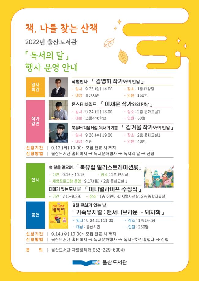 명사 특강과 작가 강연 등은 9월 13일 오전 10시, 공연은 9월 14일 오전 10시부터 울산도서관 누리집을 통해 신청할 수 있으며 기회 전시는 별도의 신청 없이 도서관 방문객이라면 누구든지 감상 가능하다.