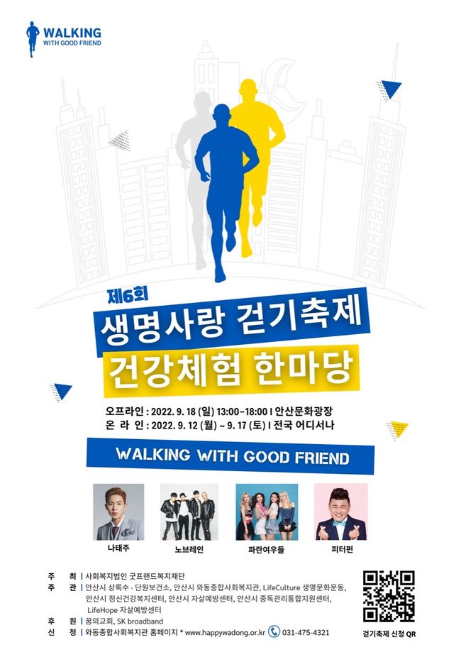 안산시는 오는 18일 안산문화광장에서 제6회 생명사랑걷기축제&건강체험 한마당 행사를 개최한다고 13일 밝혔다.
