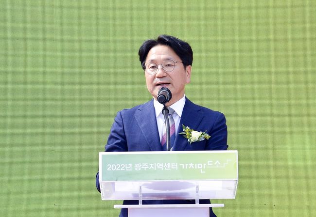 강기정 광주광역시장이 14일 오후 광산구 하남동 발달장애인 가족 특화사업장인 스마트팜 `가치만드소` 개소식에 참석해 축사를 하고 있다