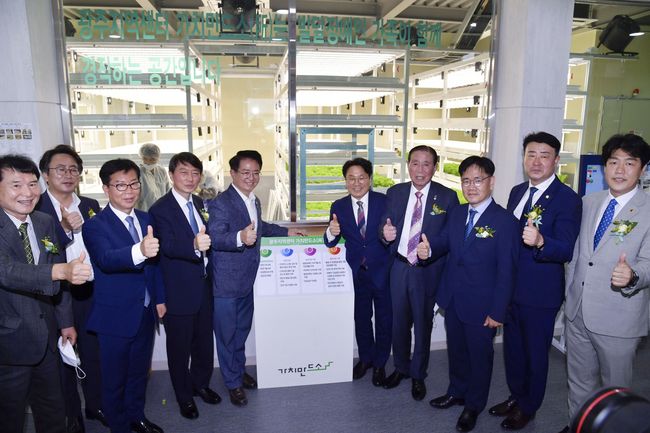 강기정 광주광역시장이 14일 오후 광산구 하남동 발달장애인 가족 특화사업장인 스마트팜 `가치만드소` 개소식에 참석해 이용빈 국회의원, 박병규 광산구청장 등 내빈들과 생산시설 앞에서 기념촬영을 하고 있다.
