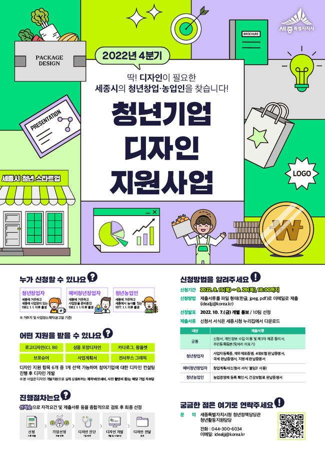 세종특별자치시가 디자인 투자 여력이 부족한 청년창업자와 청년농업인에게 디자인 개발을 지원하는 ‘청년기업 디자인 지원사업’을 추진한다고 밝혔다.