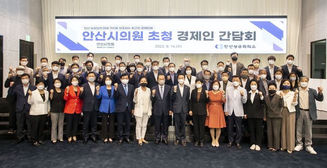 안산시의회 의원들이 14일 안산상공회의소가 주최한 `안산시의원 초청 경제인 간담회`에 참석해 지역 경제인들과 기념촬영을 하고 있다.