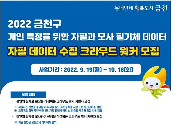 금천구는 9월 19일부터 10월 18일까지 인공지능 학습용 데이터를 구축하기 위한 크라우드 워커(crowd worker) 지원자를 모집한다고 밝혔다.