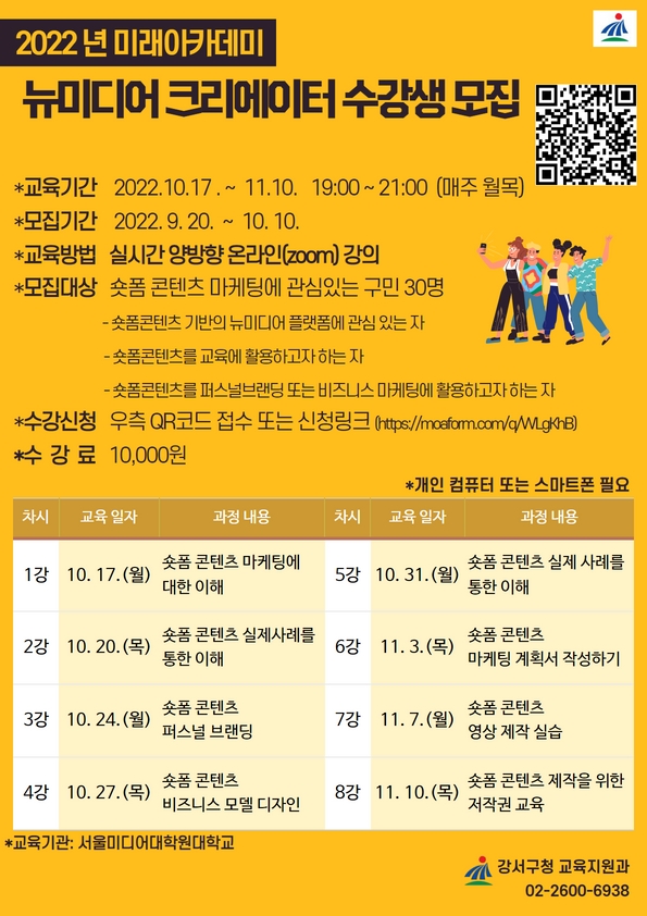 수강료는 1만 원이며 신청은 강서구에 거주하는 구민이면 누구나 QR코드 접속 또는 인터넷 설문지 폼 작성으로 가능하다.