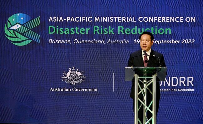 유정복 인천광역시장이 21일 호주 브리즈번 컨벤션센터에서 UNDRR 주최로 열린 `제9차 아시아 · 태평양 재난위험 경감 각료회의(APMCDRR)`에서 `재난복원력 있는 도시 인천`을 주제로 연설을 하고 있다.