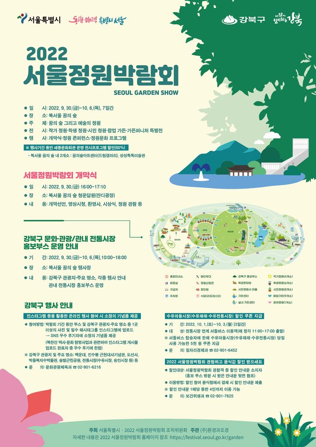 서울 강북구가 북서울꿈의숲에서 개최되는 ‘2022 서울정원박람회’ 기간 동안 관람객을 대상으로 음식점 가격 할인행사 등을 추진한다고 밝혔다.