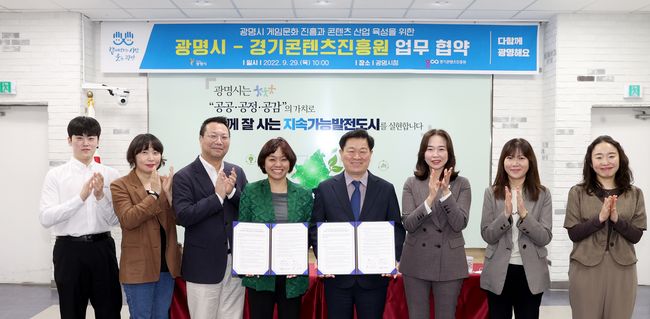광명시는 29일 시청 중회의실에서 지역사회의 건전한 게임문화 진흥과 콘텐츠산업 육성을 위해 경기콘텐츠진흥원과 업무협약을 체결했다. 협약식에는 박승원 광명시장, 민세희 경기콘텐츠진흥원장 및 관계자 등이 참석했다.