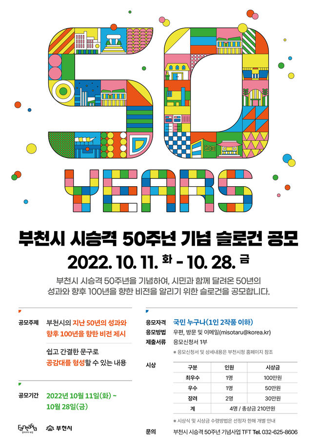 출품작은 시민과 전문가의 공정한 심사를 통해 당선작을 선정하며, 2023년 한해 동안 부천시 시승격 50주년을 홍보하는 데 활용된다.