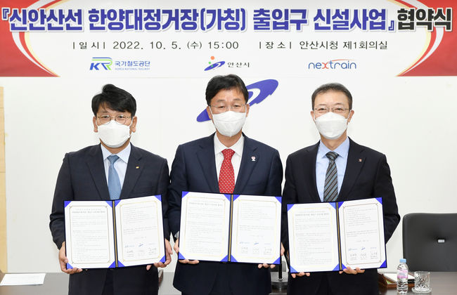 6일 시에 따르면 안산시는 지난 5일 안산시청에서 국가철도공단 및 신안산선 사업시행자인 넥스트레인과 ‘신안산선 한양대정거장(가칭) 출입구 신설사업’을 위한 협약식을 개최했다고 밝혔다.