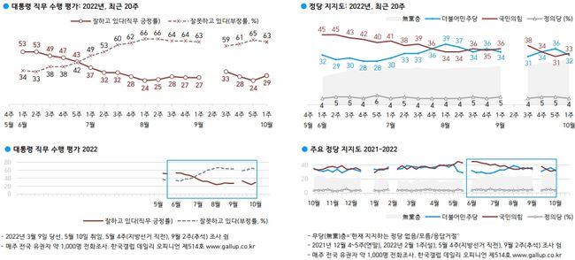한국갤럽이 2022년 10월 첫째 주(4~6일) 전국 만 18세 이상 1,002명에게 윤석열 대통령이 현재 대통령으로서의 직무를 잘 수행하고 있다고 보는지 잘못 수행하고 있다고 보는지 물은 결과, 29%가 긍정 평가했고 63%는 부정 평가했으며 그 외는 의견을 유보했다(어느 쪽도 아님 2%, 모름/응답거절 6%).