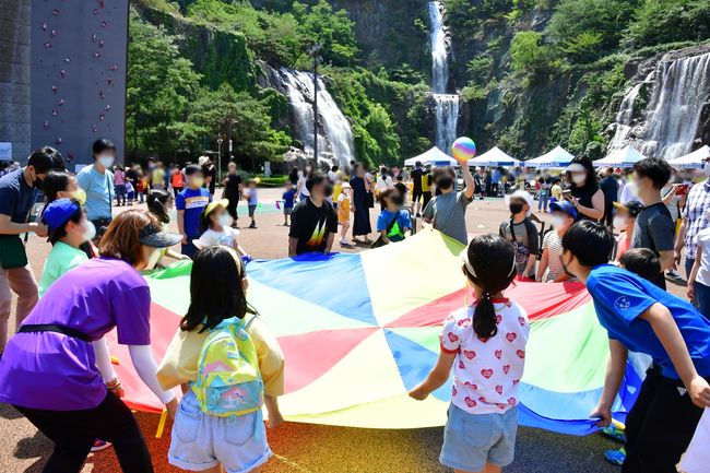 지난 6월 열린 어린이 놀이 한마당에서 `낙하산 놀이`를 즐기고 있는 아이들의 모습