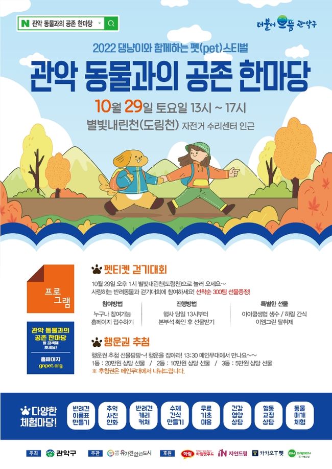 관악구가 올바른 반려동물 돌봄 문화를 확산하고 동물 복지 향상을 선도하기 위해 오는 29일 관악구 자전거 종합센터 밑 별빛내린천에서 `2022 관악 동물과의 공존 한마당` 반려동물 축제를 개최한다고 밝혔다.