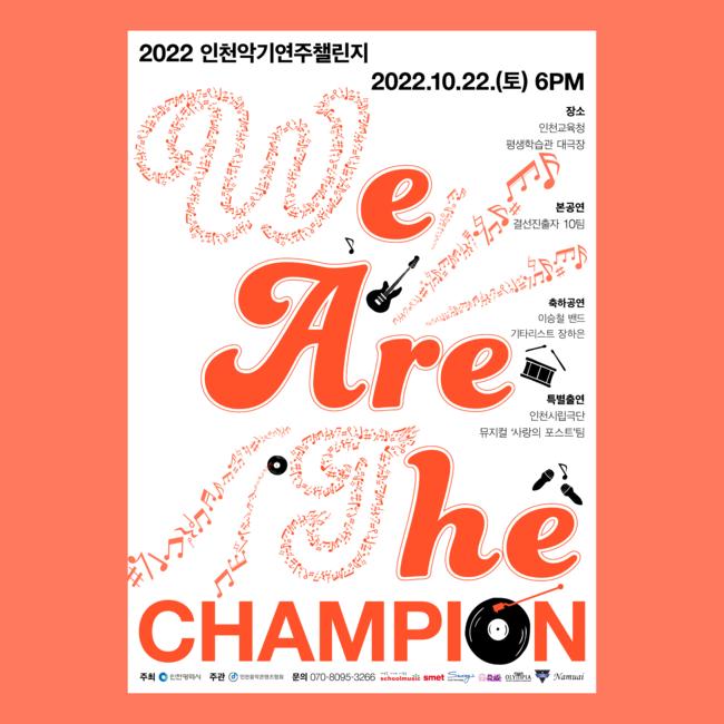 인천광역시가 주최하고 인천음악콘텐츠협회가 주관하는 ‘2022 인천 악기연주챌린지’가 오는 10월 22일 저녁 6시 인천평생학습관에서 개최된다. 코로나19로 지친 시민들에게 악기로 전달할 수 있는 음악적 감동을 만들고자 ‘악기’와 ‘가족’, ‘화합’을 주제로 진행된다고 밝혔다.