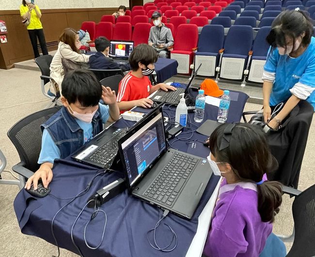 노트북으로 NFT픽셀아트를 체험하는 어린이들