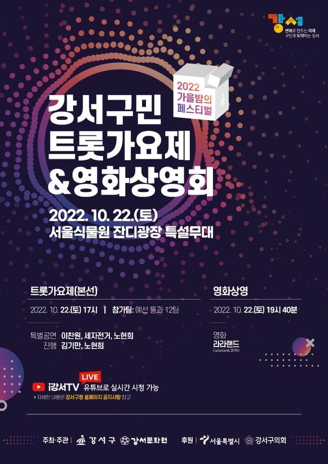 서울 강서구는 오는 22일 오후 5시 서울식물원 잔디광장에서 ‘2022 가을밤의 페스티벌 강서구민 트롯가요제&영화상영회’를 개최한다고 밝혔다.