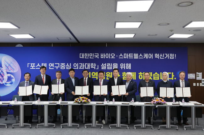 협약내용으로는 △의대 및 병원 설립의 행정사항 지원(경북도·포항시) △바이오헬스산업 원천기술 개발과 사업화 지원(포스텍) △인력 교류, 의료·의과학·의공학 분야 공동연구, 임상데이터 공유 플랫폼 구축(포항지역 6개 병원)을 담고 있다.