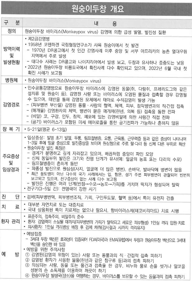 훈련의 주요 내용은 ▲‘원숭이두창 역학적 특성과 대응 방안’에 대한 광주시 감염병관리지원단장(김성은 전남대 감염내과 교수) 강의 ▲감염병 취약시설 대응사례 발표 ▲원숭이두창 의심환자의 역학조사, 확진자 관리 등 대응 방안을 도출하는 토론기반 훈련 ▲원숭이두창 위기경보(주의단계) 대응 관련 역할극 및 퀴즈 등 실행기반 훈련 ▲개인보호복(레벨D) 착·탈의 훈련 등 실습 등이다.