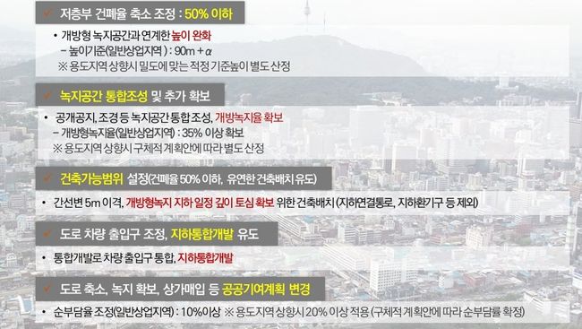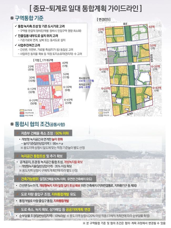 서울시가 마련한 종묘~퇴계로 일대에 적용되는 지침(가이드라인)은 지난 4월 시가 발표한 「녹지생태도심 재창조 전략」의 규제완화방안을 보다 구체화한 것이다. 큰 틀에서 ▴구역통합 기준 등 개발방향 ▴규제완화사항 ▴공공기여 방안 등을 담고 있다.