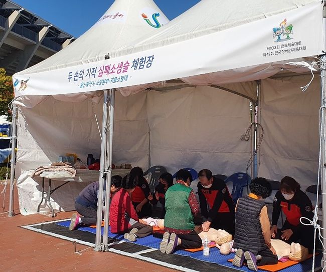 울산시 소방본부는 제103회 전국체육대회 및 제42회 장애인체육대회 기간 중 울산종합운동장에서 심폐소생술 체험장을 운영해 시민들로부터 큰 호응을 얻었다고 밝혔다.
