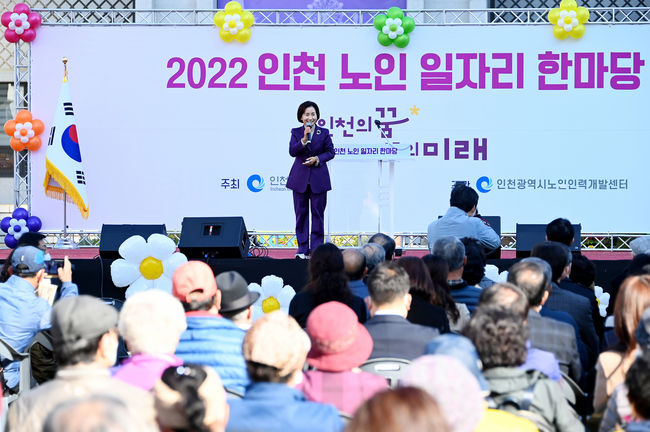 이행숙 문화복지정무부시장이 26일 시청 앞 인천애뜰에서 열린 `2022 인천 노인일자리 한마당`에서 축사를 하고 있다.