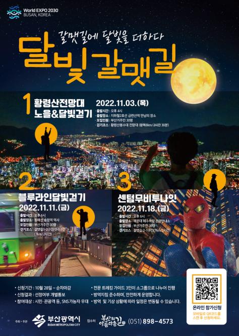 이번 행사는 야간에 갈맷길을 걸으며 부산의 야경, 맛집, 볼거리 등을 체험하는 프로그램으로, 주요 야경명소 현장답사를 통해 3곳을 선정한 결과 ▲11월 3일 황령산전망대 노을&달빛걷기 ▲11월 11일 블루라인 달빛걷기 ▲11월 18일 센텀 무비투나잇 순으로 진행될 예정이다.