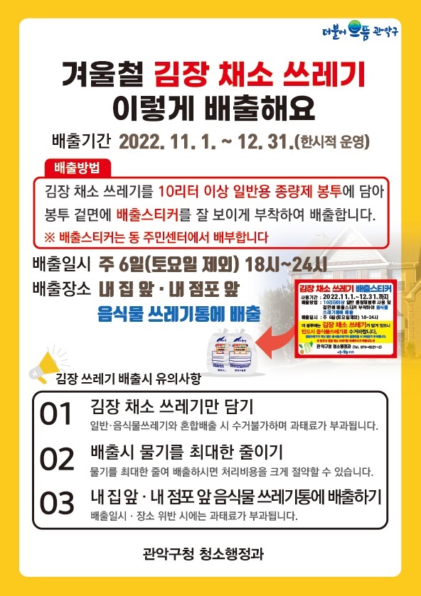 관악구가 본격적인 김장철을 맞아 구민들이 김장쓰레기 배출에 불편함이 없도록 김장쓰레기 특별 수거기간을 운영한다고 밝혔다.