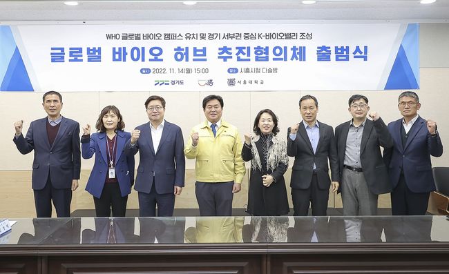 글로벌 바이오 허브 추진협의체 출범식 글로벌 바이오 허브 추진협의체는 지난 9월 1일 경기도, 시흥시, 서울대학교가 체결한 ‘글로벌 의료·바이오산업 혁신 생태계 조성을 위한 업무협약’에 따른 것이다. 경기도 미래성장정책관과 시흥시 부시장, 서울대 연구처장 등 총 17명으로 이뤄졌으며 월 2회 정기회의와 수시회의를 진행할 계획이다.