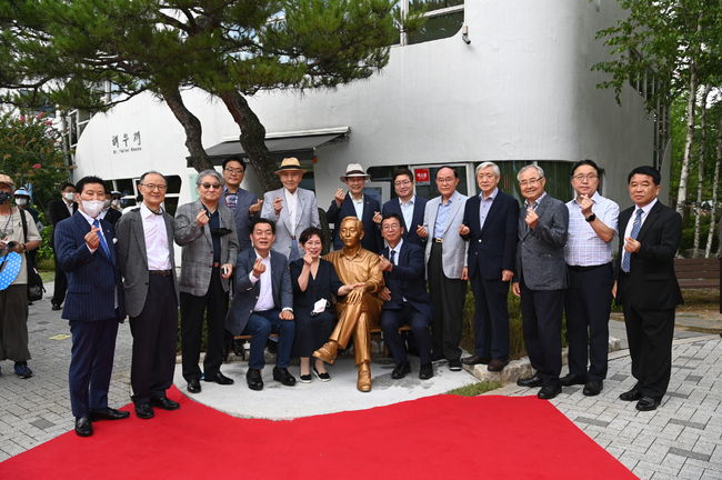 지난 7월16일 해우재에서 `미스터토일렛 심재덕 조형물 제막식`이 열려 이재준 수원시장과 관계자들이 동상과 함께 기념촬영을 하고 있다.