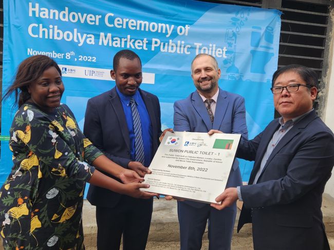 지난 11월8일 잠비아 치볼야마켓 수원화장실 준공식에서 수원화장실이라고 적힌 현판이 전달되고 있다. 수원화장실 대상지는 설비와 위생시설이 열악한 다중이용지역을 중심으로 선정된다. 낙후한 시설로 불편을 겪는 관광객은 물론 주민들에게도 깨끗한 화장실을 만들어 깨끗한 화장실의 본보기를 만들기 위해서다.