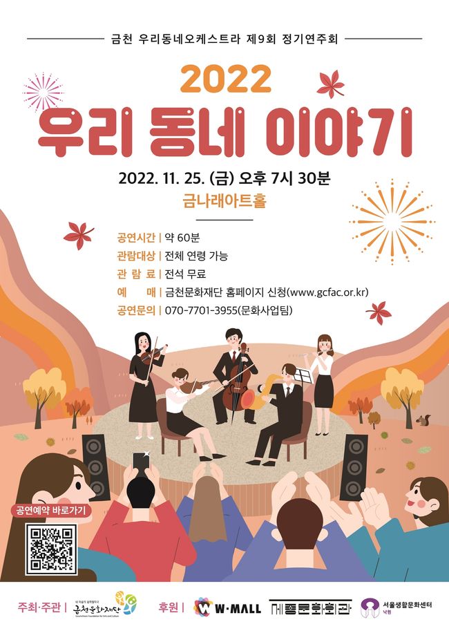이번 음악회는 총 29명의 단원들이 지난 1년간 갈고닦은 실력을 선보이는 자리로, ‘우리 동네 이야기’라는 주제에 맞춰 금천에 대한 이야기와 오케스트라 연주를 들려줄 예정이다.