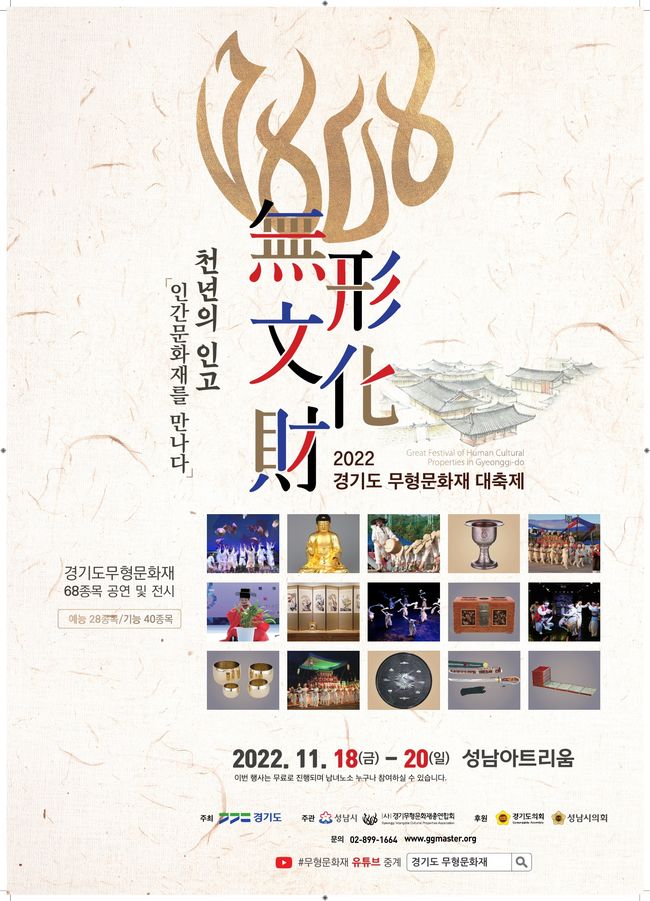 경기도가 11월 18일부터 20일까지 성남아트리움에서 경기도무형문화재 68개 종목을 대중에 공개하는 ‘2022 경기도 무형문화재 대축제’를 개최한다고 밝혔다.