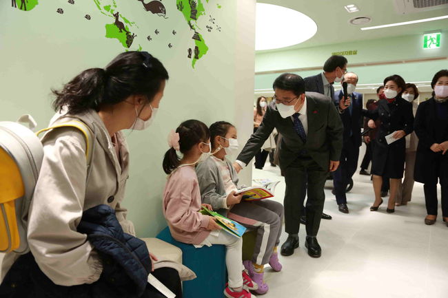 문헌일 구청장이 항동 푸른 도서관 시설라운딩을 하며 아이들과 이야기를 나누고 있다