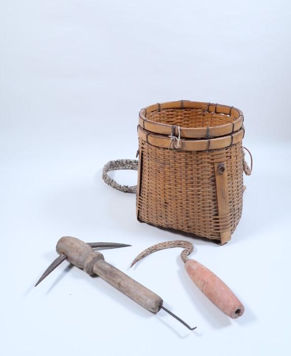 대나무로 단단하게 만들어진 물고기 바구니는 근대기까지 사용된 전통적인 어구로 물고기를 잡아 임시로 보관하거나 운반하는 용도로 사용됐다. 이 물고기 바구니는 크기가 다른 두 개의 대바구니가 겹쳐진 형태로 아래쪽 바구니는 물고기를 담을 수 있도록 깊게 만들어졌고, 위쪽 바구니는 뚜껑 겸 조개・굴 등을 채취해 담을 수 있도록 만들어졌다. 어깨에 지고 다닐 수 있도록 천으로 된 긴 끈이 달려있다.