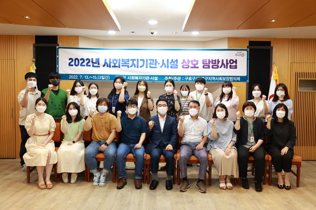 문헌일 구청장(앞줄 가운데)이 지난 7월 13일부터 7월 15일까지 진행된 사회복지기관․시설 탐방에 앞서 신규 사회복지사들과 기념촬영을 했다.