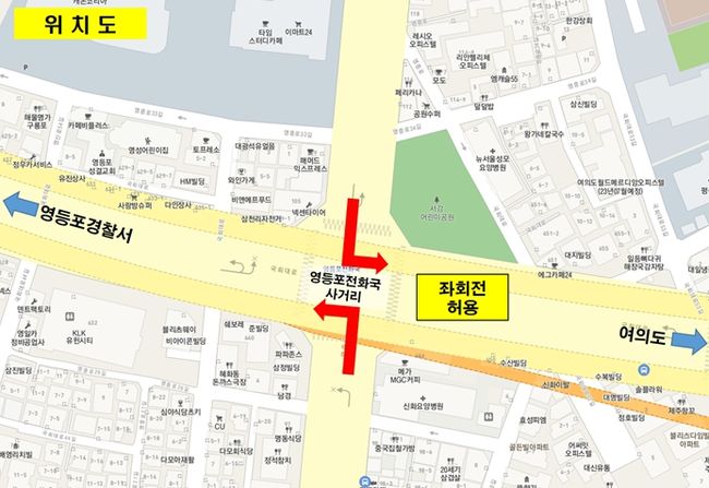 영등포구는 12월 2일부터 국회대로 영등포전화국사거리 교차로에서 모든 차량의 좌회전을 허용한다고 밝혔다.