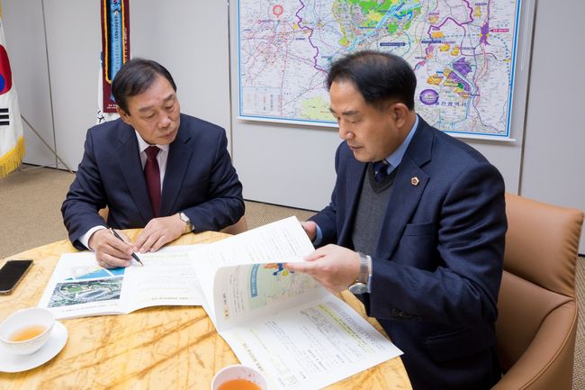 최민호 세종시장과 상병헌 세종시의회 의장은 5일 시장 집무실에서 2027 하계세계대학경기대회 준비를 위한 논의를 갖고 시 최대 현안 사업인 대평동종합체육시설 조성에 힘을 모으기로 했다.