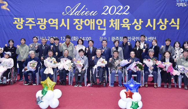 6일 오후 광주시장애인국민체육센터에서 열린 ‘2022 광주시 장애인체육상 시상식’에는 강기정 시장, 정무창 시의회 의장, 이정선 시교육감, 장애인체육회 이사, 종목별 가맹단체장, 선수 등 300여 명이 참석했다.