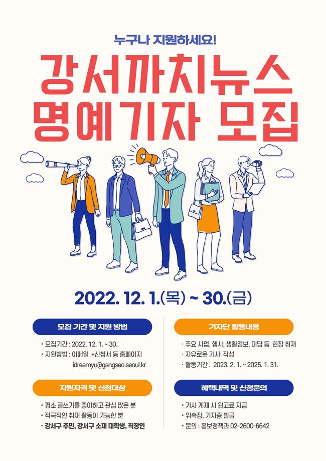 서울 강서구는 30일까지 제14기 ‘강서까치뉴스 명예기자’를 모집한다고 밝혔다.
