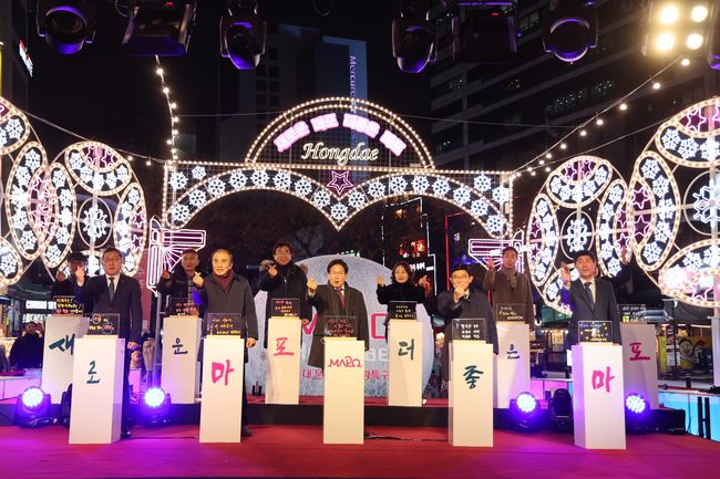 지난 12월 6일 홍대 문화예술 관광특구 빛 거리 점등식에서 점등행사를 하고 있는 박강수 마포구청장(가운데)