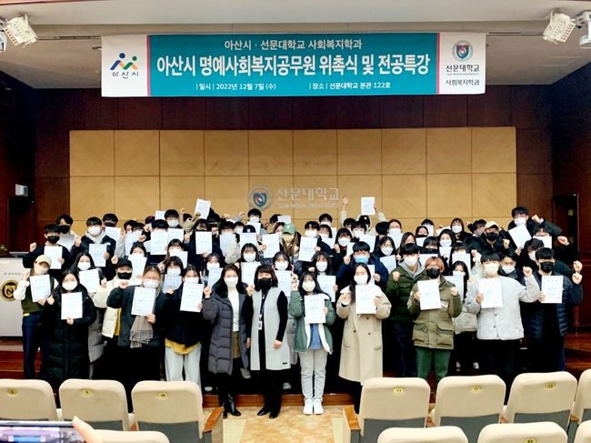 아산시가 지난 7일 선문대학교 사회복지학과 학생 등 80여 명을 대상으로 통합사례관리 특강을 진행하고 명예 사회복지공무원으로 위촉했다고 밝혔다.